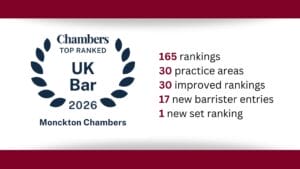 Chambers UK Bar have launched their 2026 guide, and Monckton Chambers is delighted to be ranked as a set in 12 practice areas, with 64 individual barristers recognised for a total of 165 rankings across 30 practice areas. We are pleased to see 17 new entries including a new set ranking for CDR and a further 30 improved barrister rankings. Congratulations to all members listed.